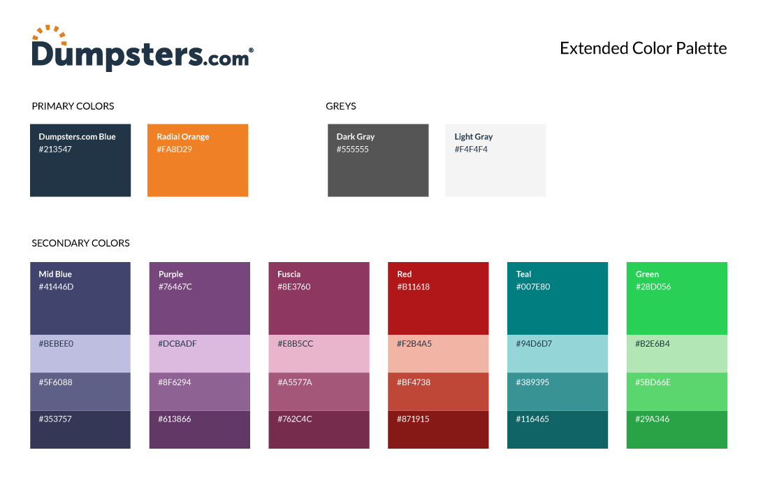 Our design guidelines ensure consistency across channels and touchpoints. These essential visual components of the Dumpsters.com brand convey our point of view and are intentionally designed to advance the brand strategy.