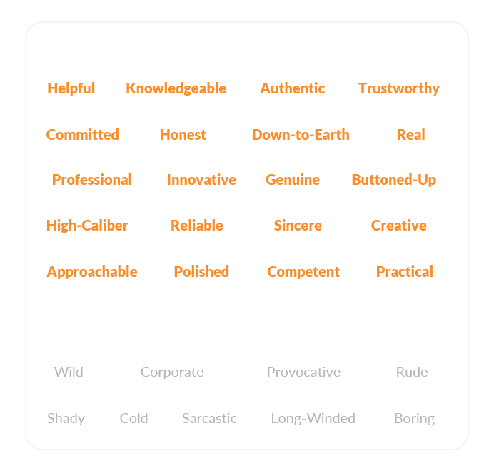 We are helpful, down-to-earth and buttoned-up. We are respectful and get down to business, but we won't try to impress you with big, fancy words.